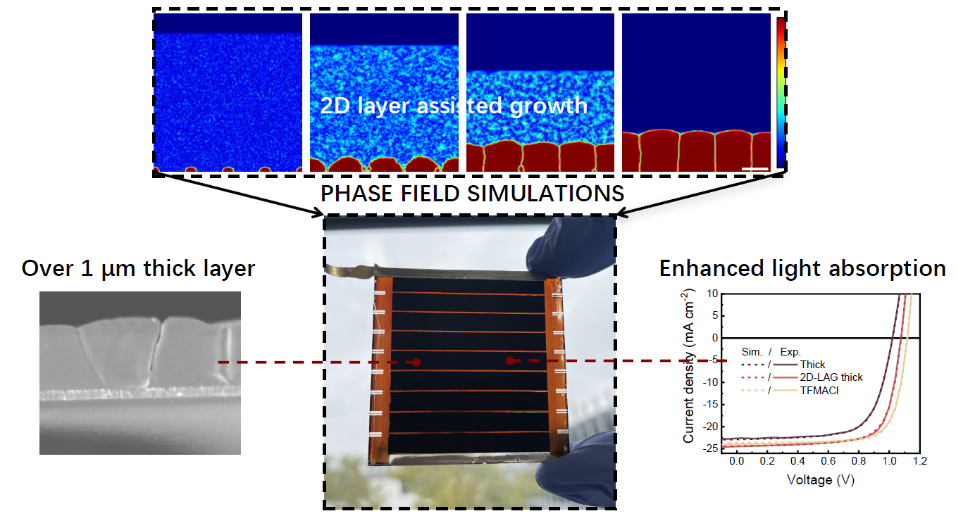 The work addresses a key challenge in fully printed perovskite photovoltaics with non-reflective carbon electrodes: the formation of bottom voids in thick perovskite layers (>600 nm), which are detrimental to light absorption and significantly compromise device performance. In collaboration with the phase-field simulation group led by Prof. Jens Harting (HIERN), we demonstrate that these voids originate from trapped residual solvents—resulting from nanocrystal aggregation at the liquid–vapor interface during the drying process.To overcome this, we propose a two-dimensional (2D) perovskite layer-assisted growth (2D-LAG) strategy that promotes heterogeneous nucleation at the substrate interface. This accelerates the crystallization of three-dimensional (3D) perovskites and prevents solvent entrapment. The strategy enables the formation of highly crystalline, void-free perovskite films exceeding one micrometer in thickness and facilitates the fabrication of high-efficiency, fully printed devices.